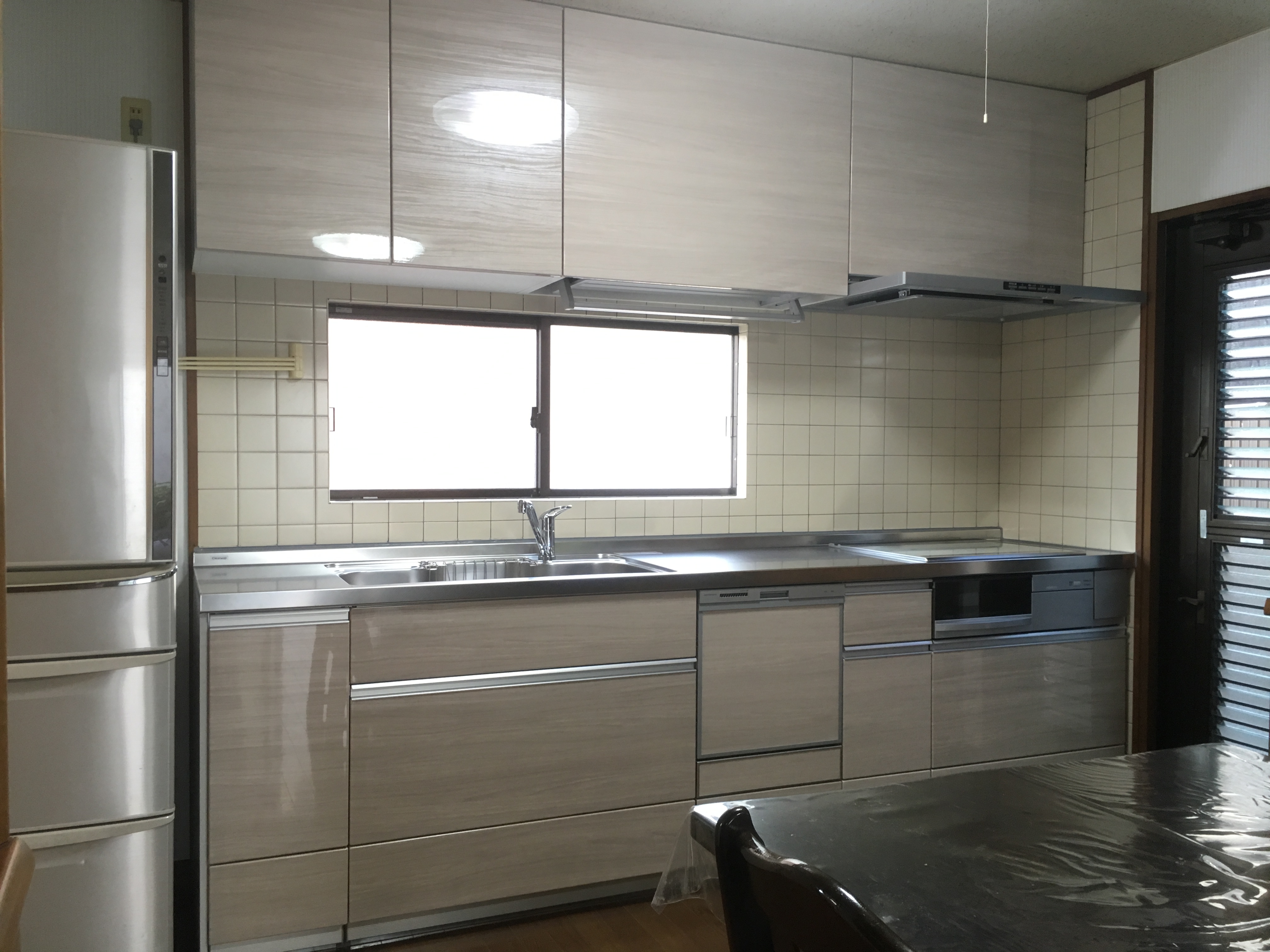 既存のキッチンは開き戸で中に収納しているものが出し入れしにくい状態でした。また、内装クロスの長年の汚れがあり内装クロスの張替えもご依頼頂きました。