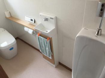 小便器、手洗器共に自動で流れる水栓を取付け、かざすだけで手が洗えるようになっています。