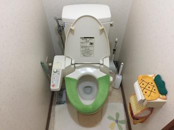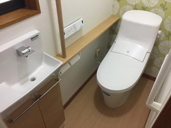 トイレは節水型に取替えました。内装もリフォームしてとても明るい雰囲気になりました。 手洗い器はカウンター付で、手すりを取付けてお母様にも安心して使っていただけるようになっています。