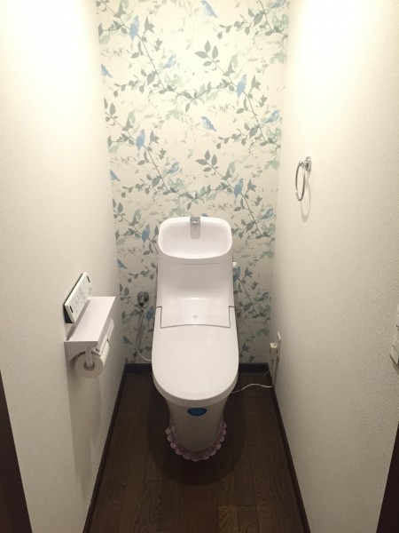 またトイレスペースをつくるのに新しく壁や扉を設置。外側の壁にはオシャレなレンガ調のクロスを貼りました♪工事後、ご家族皆さまで快適に使っていただいております!