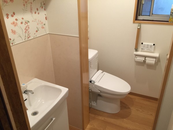 化粧台周りにはキッチンパネルを腰壁まで張り飛び散りを掃除しやすいよう工夫し、クロスはご家族が決めた花柄の壁紙を貼りました。 トイレも広くなり使いやすくなったと大変喜んでいただけました!