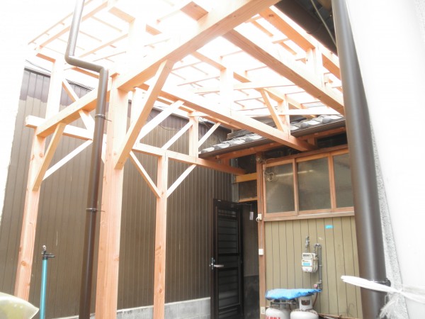 隣の建物が隣接していて、太陽の光が入りにくい作りになっておりました。 まずは既存の壁・屋根を撤去して、何もないフラットな状態にして柱を立てて、新しく屋根を作っていきました。