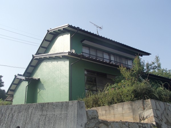 家が目印になるような目立つ色にしたい!とのお客さんのご希望で緑ベースの色にしています。 屋根は黒色で、屋根・外壁ともにシリコン塗料を使用しています。