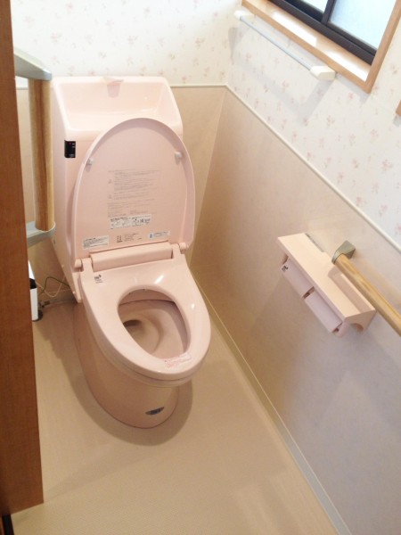 小便器と大便器が二つあったスペースを一つにまとめて広いトイレスペースに! 使用後に自動に流れるLIXILのアメージュZを設置して、壁は掃除しやすいパネルを貼りました。内装のデザインもピンクで統一して明るく、使い易いトイレになったと喜んでいただけました!