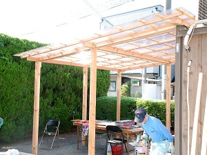 | ご提案内容 | 既存のスーパーハウスの裏に、軒+格子+入り口を取り付け、お客様と、打ち合わせを重ね、虹色を決定し、塗り上げました。 |